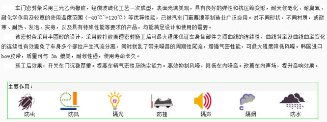1.耐老化、耐高溫 2.耐候性好,耐臭氧 3.良好的彈性和抗壓縮變形 4.提高車輛氣密性及防塵力 5.高效抑制風(fēng)噪,降低車內(nèi)噪音 |